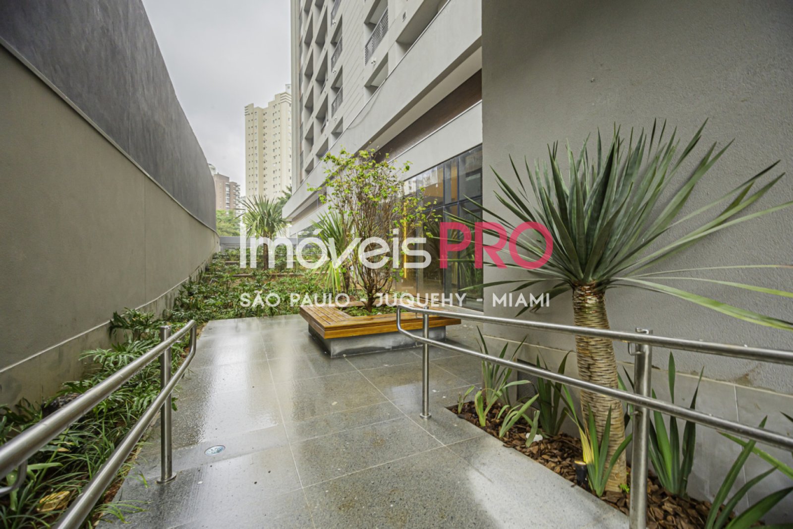 Câmeras de segurança, portaria blindada, previsão de automação nos apartamentos e reuso pluvial para irrigação dos jardins.