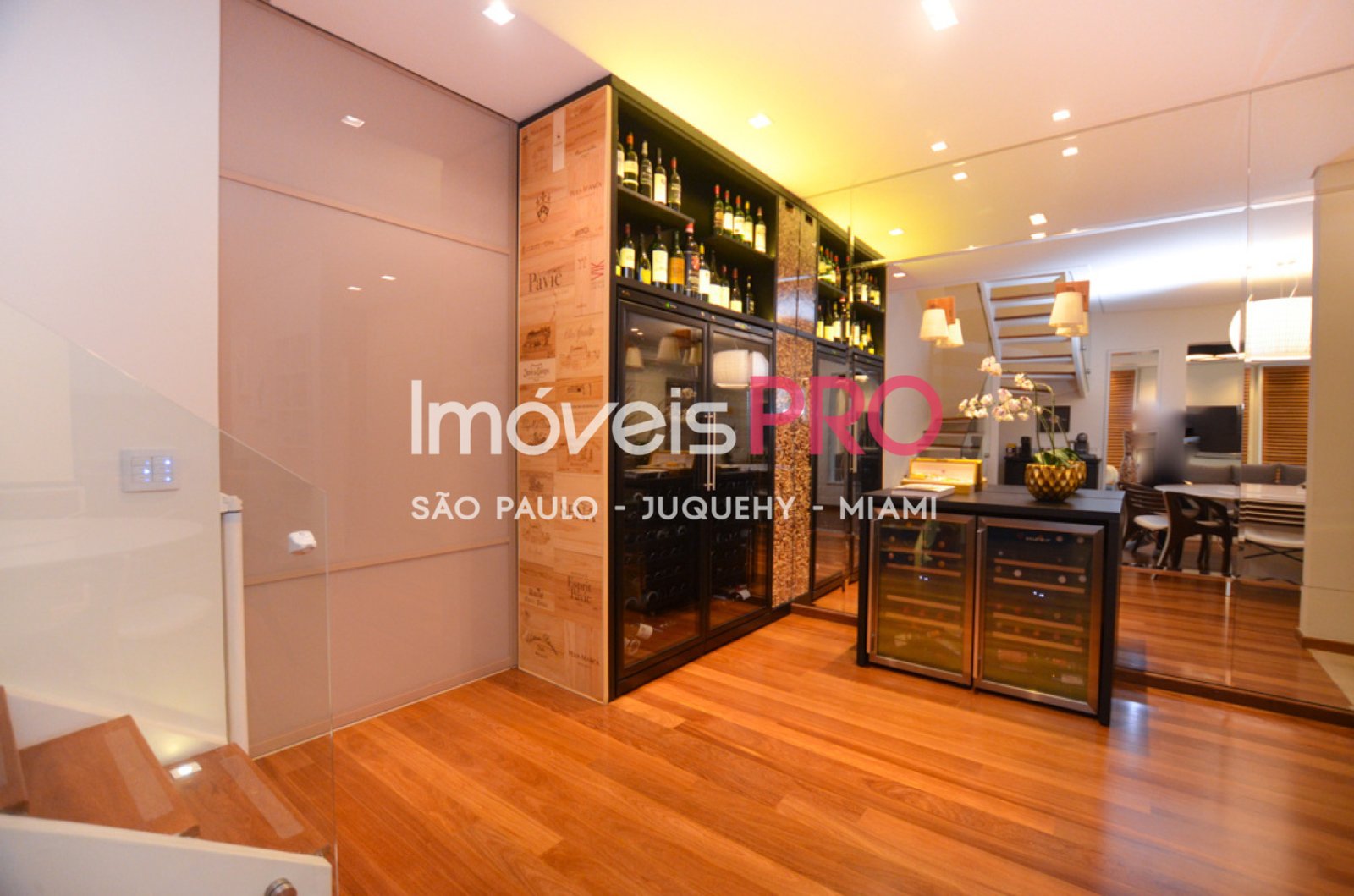 - Adegas com móveis planejados com capacidade total para 466 garrafas, sendo 30 de vinho branco + painel decorativo com caixas de vinho e painel decorativo de acrílico com rolhas de vinho.