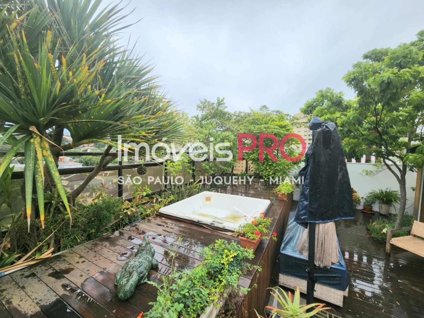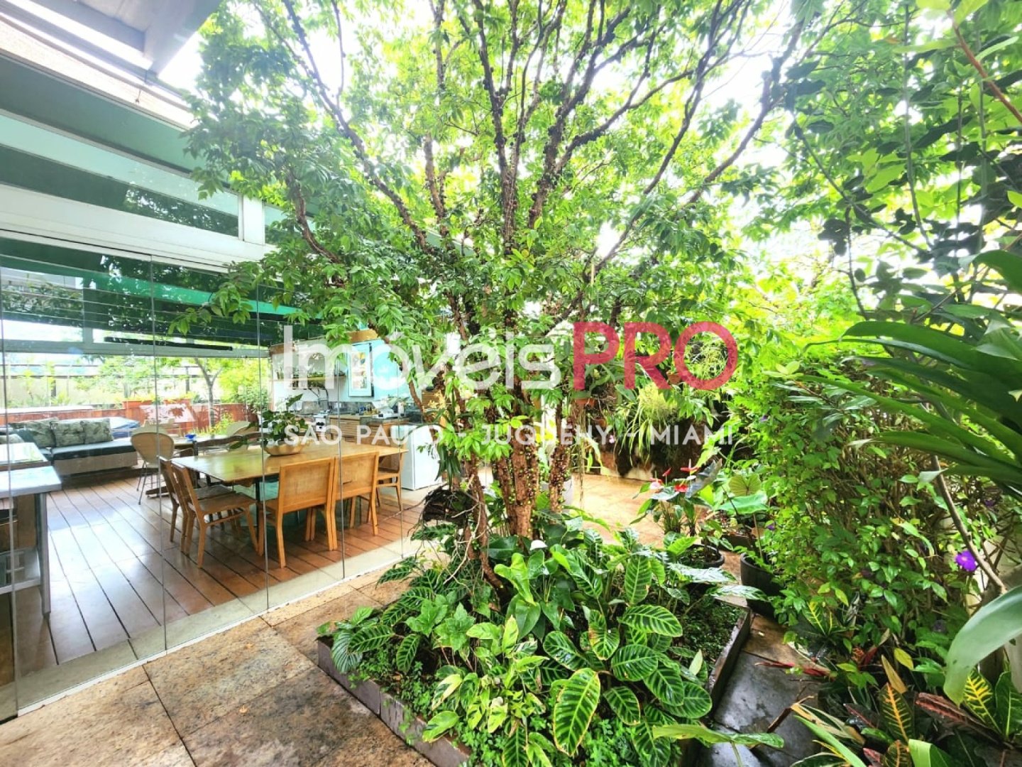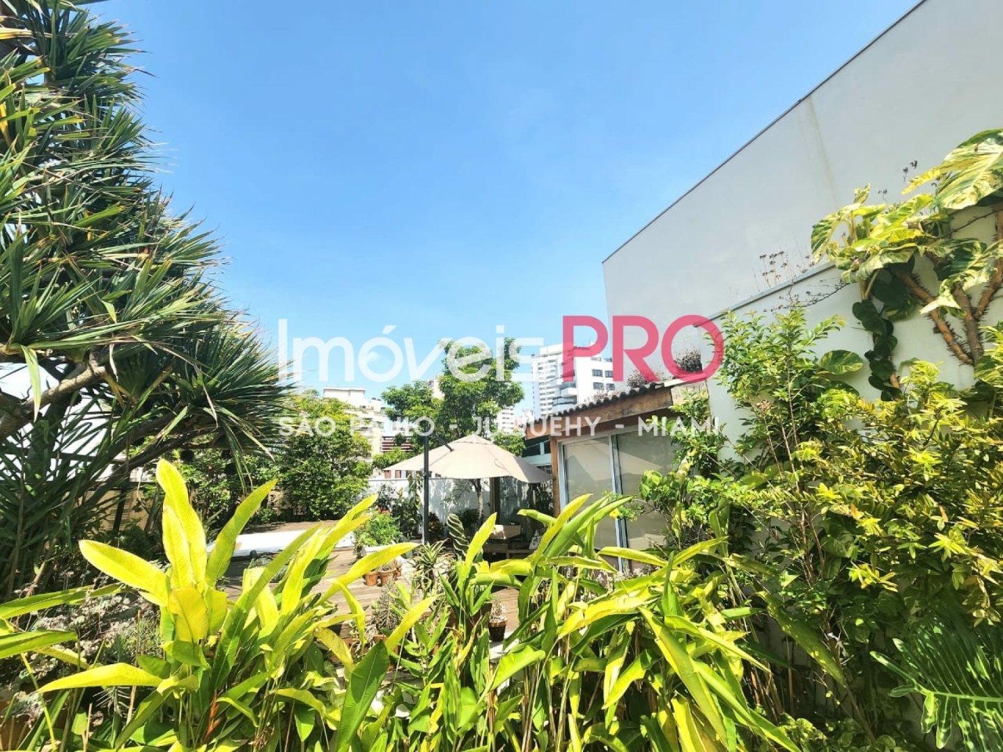 O jardim e composto por um refinado projeto paisagistico que contempla um pomar com especies nativas da mata Atlantica e muitas outras exuberantes. Ha tambem solarium, ofuro e espaco para acomodar uma piscina com raia privativa se desejado.