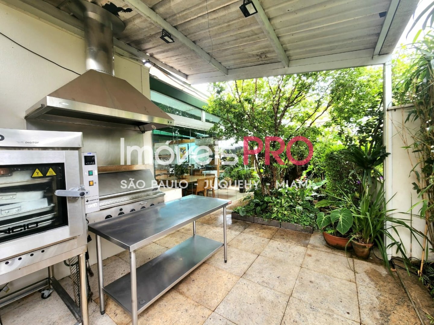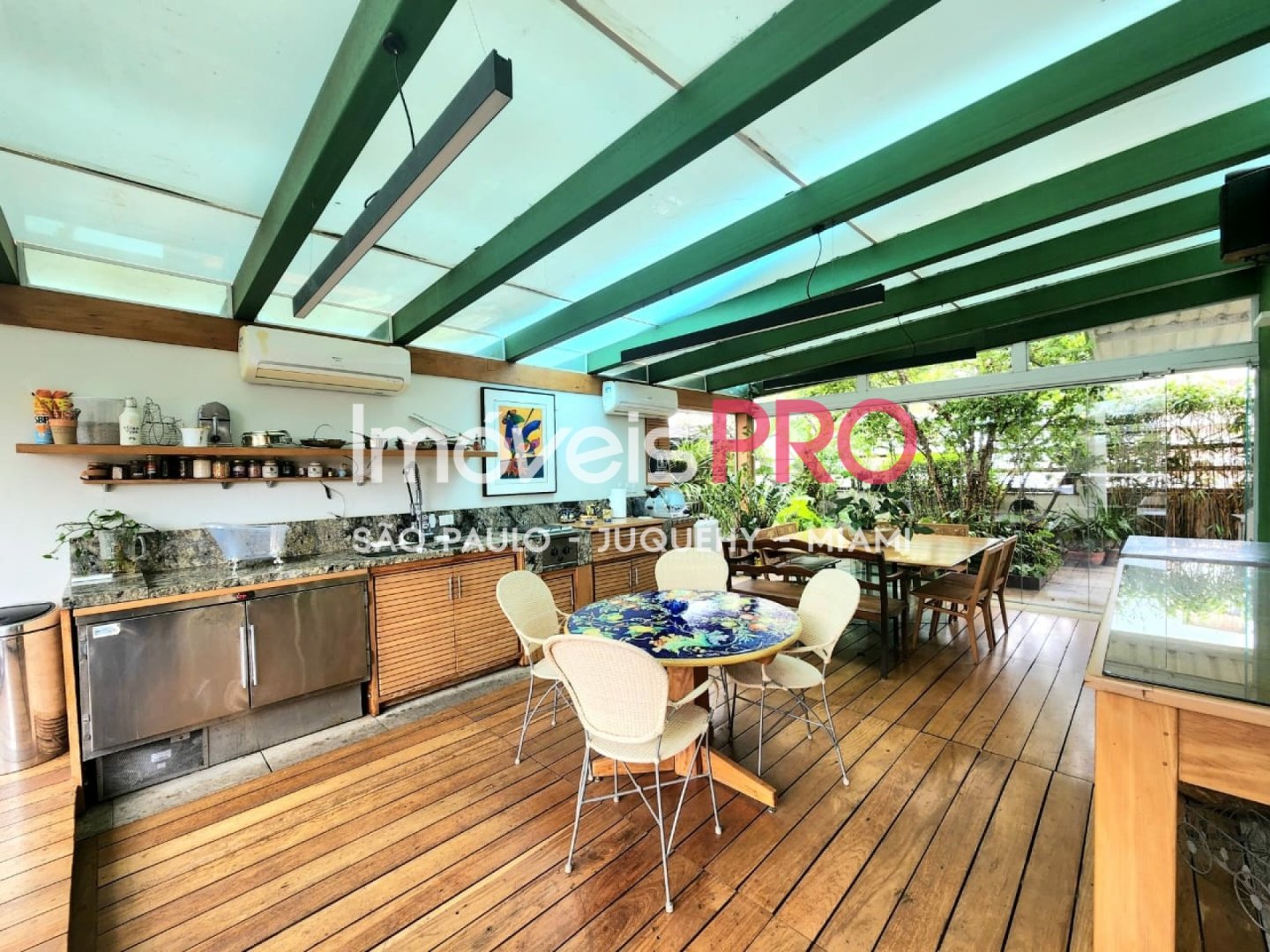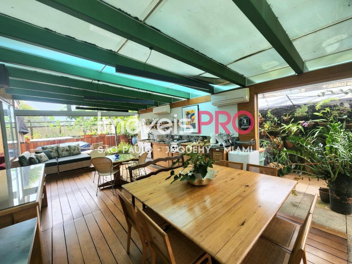 O jardim e composto por um refinado projeto paisagistico que contempla um pomar com especies nativas da mata Atlantica e muitas outras exuberantes. Ha tambem solarium, ofuro e espaco para acomodar uma piscina com raia privativa se desejado.